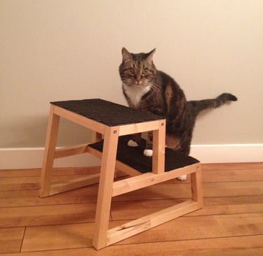 Katten Baltazar med sin trappa som hjälper till att komma upp och sova med matte & husse i sängen igen.