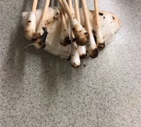 Rikligt svart-brunt sekret i båda öronen, ofta torrt och ser ut som kaffesump